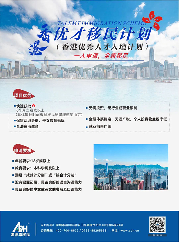 过去一年年薪达到港币250万元以上的人才,不论学历可申请,不设限额; 2毕业于全球百强大学并在过去5年累积3年或以上工作经验,不设限额。 3未符合工作经验要求,但5年内毕业于百强大学毕业生,限额10000名。 过去5年内曾上榜的学校都计算在内,全球共有176所高校,其中香港本地大学有5所,内地有9所大学上榜。包括:清华大学、北京大学、复旦大学、上海交通大学、浙江大学、中国科学技术大学、南京大学、中山大学、华中科技大学。 只要拥有以上9所内地名校本科学位,不论是否有高薪、处于高管、所在行业等等,都拥有申请“香港高才通”计划的资格。 并且要特别注意的是:计划推行初期只接受全球百强名校学士学位毕业生申请。 高才通计划可以2+3+3一般模式,或2+6的高精尖人才模式进行续签。续签时申请人必须在港已获得聘用,或已在香港开办或参与任何业务。 “香港优秀人才入境计划”,是香港特区政府为了吸引优秀人才赴港定居,借以提升香港的国际竞争力,于2006年6月正式推行的。 2021年,港府将香港优才配额从2,000翻倍至4,000,如今直接取消了优才名额限制为期两年,每个人的获批几率都大幅增加。 申请人曾获得杰出成就奖(如奥运奖牌、诺贝尔奖、国家/国际奖项)。 申请人能够证明其工作得到同业肯定,或对其业界的发展有重大贡献(例如获业内颁发的终生成就奖)。 ”综合计分“或”成就计分“,选择其中一种计分方式算分。 13类香港人才清单 香港发展急需的13类人才,申请优才可额外加30分!这是与大多数竞争者拉开差距的重要因素,获批的可能性就大大提高。 金融行业是香港当之无愧的龙头,金融科技、资产管理、精算师、海事保险专才等人才的需求巨大。还有IT科技人才,包括创新及科技专才、数据科学家、网络安全专家等。 高学历(名校直接加30分) 学历越高,得分越高,如拥有博士学位,或是拥有2个或以上硕士学位可以得40分。 如果是国际认可的知名院校毕业生则可直接加30分,加上了这个分数,会让申请人的竞争力大大提升! 目前国内排名前100的名校有清华大学、北京大学、中国科技大学、上海交通大学、复旦大学、浙江大学、中山大学、华中科技大学、南京大学9所。 有国际工作经验 如若申请人拥有不少于2年相当于学位程度或专家水平的国际工作经验,可获得额外加分15分。 通常来说,香港比较倾向研究型、学术型、高管型、国际型、技术型的人才,获批机率会大一些。 有名企工作经验 如拥有不少于3年相当于学位程度或专家水平的跨国公司或知名企业的工作经验,可额外再加20分。